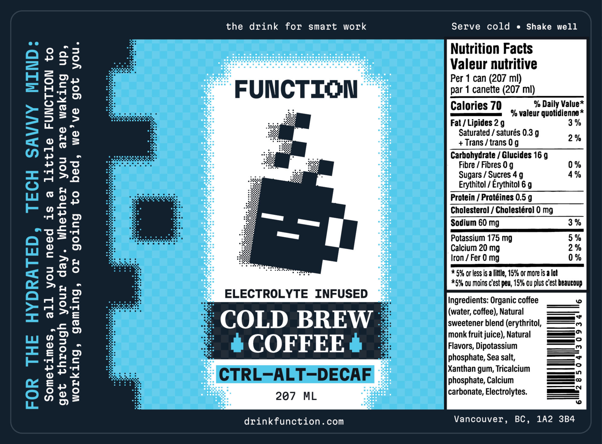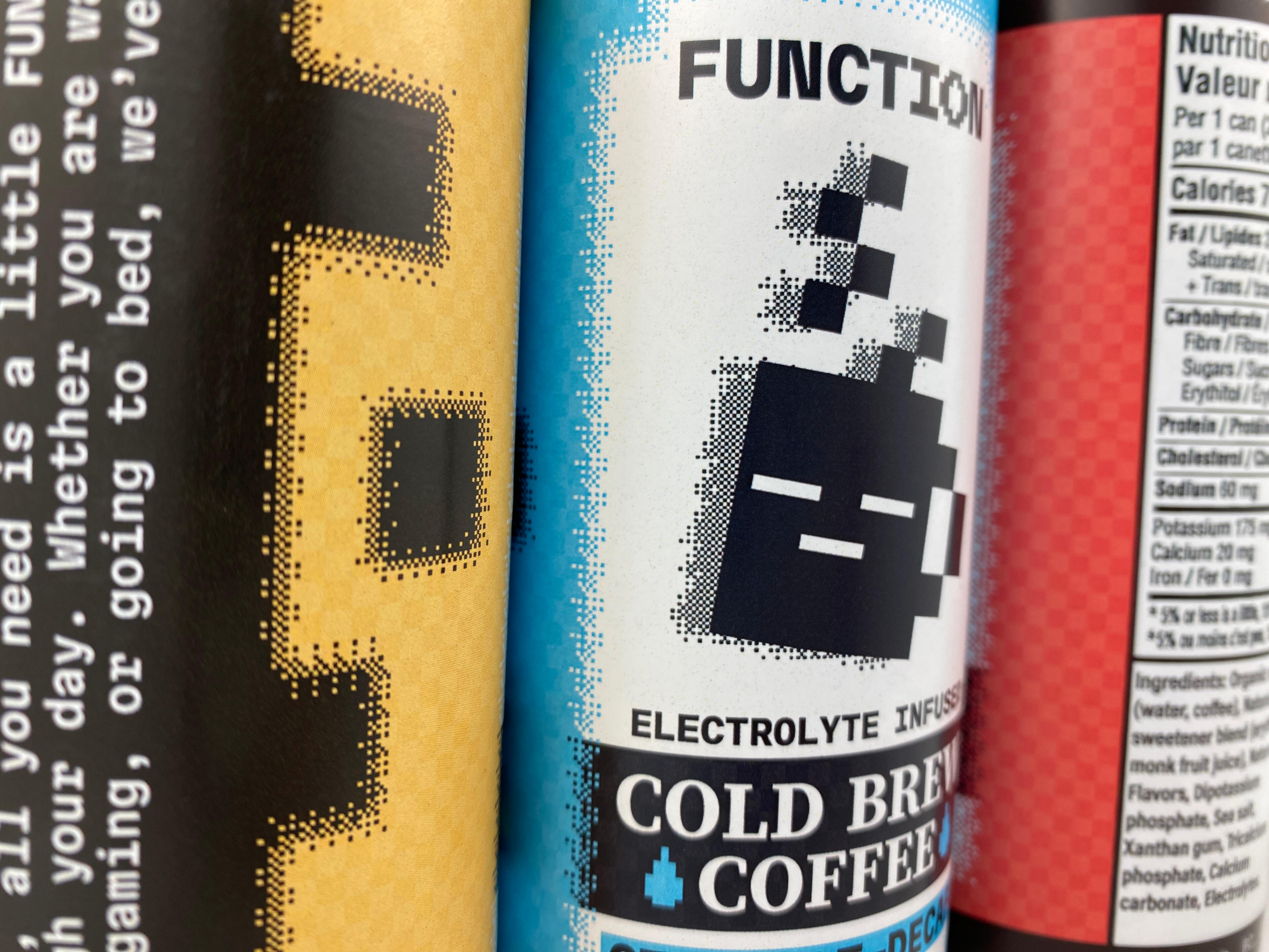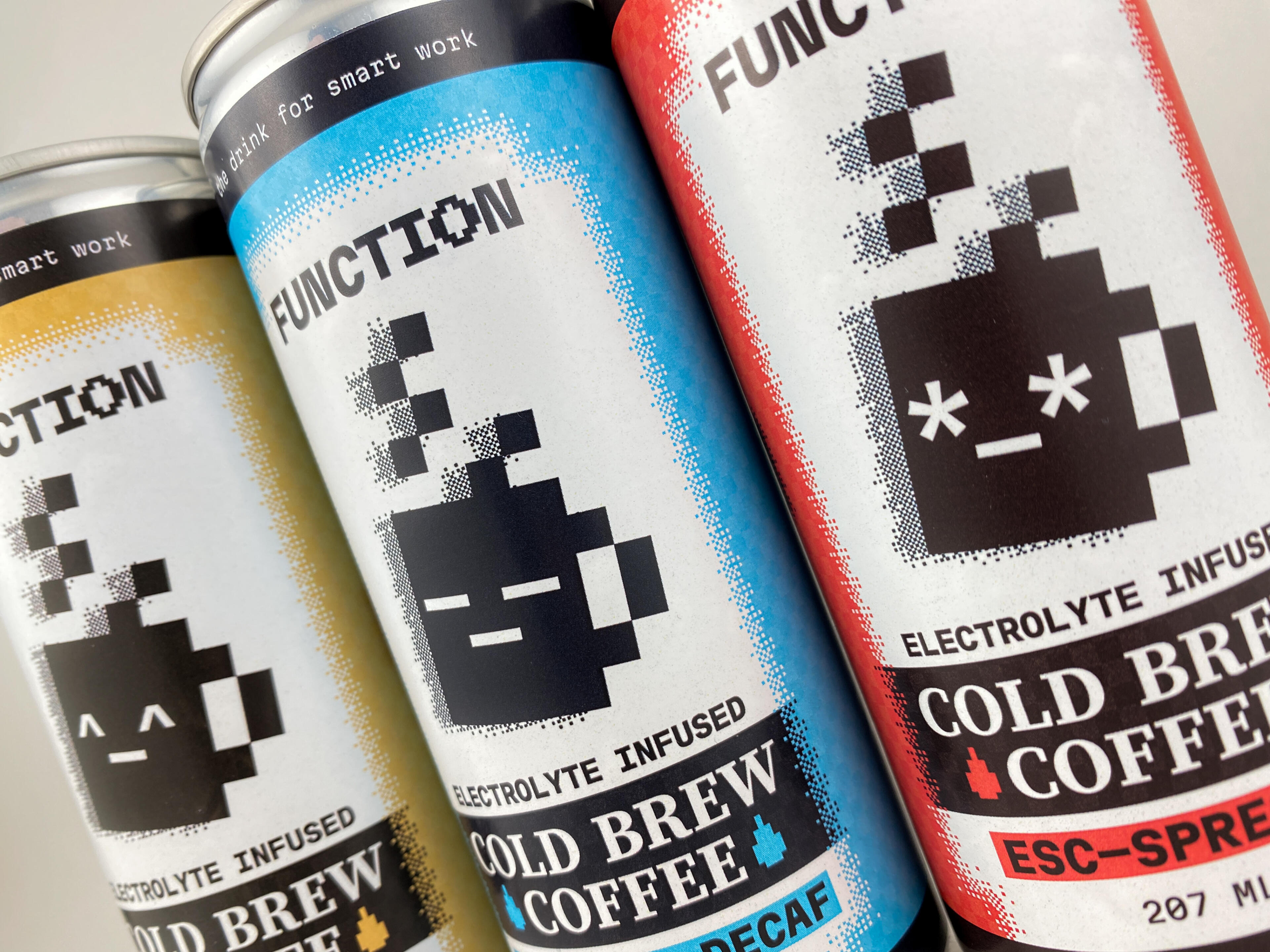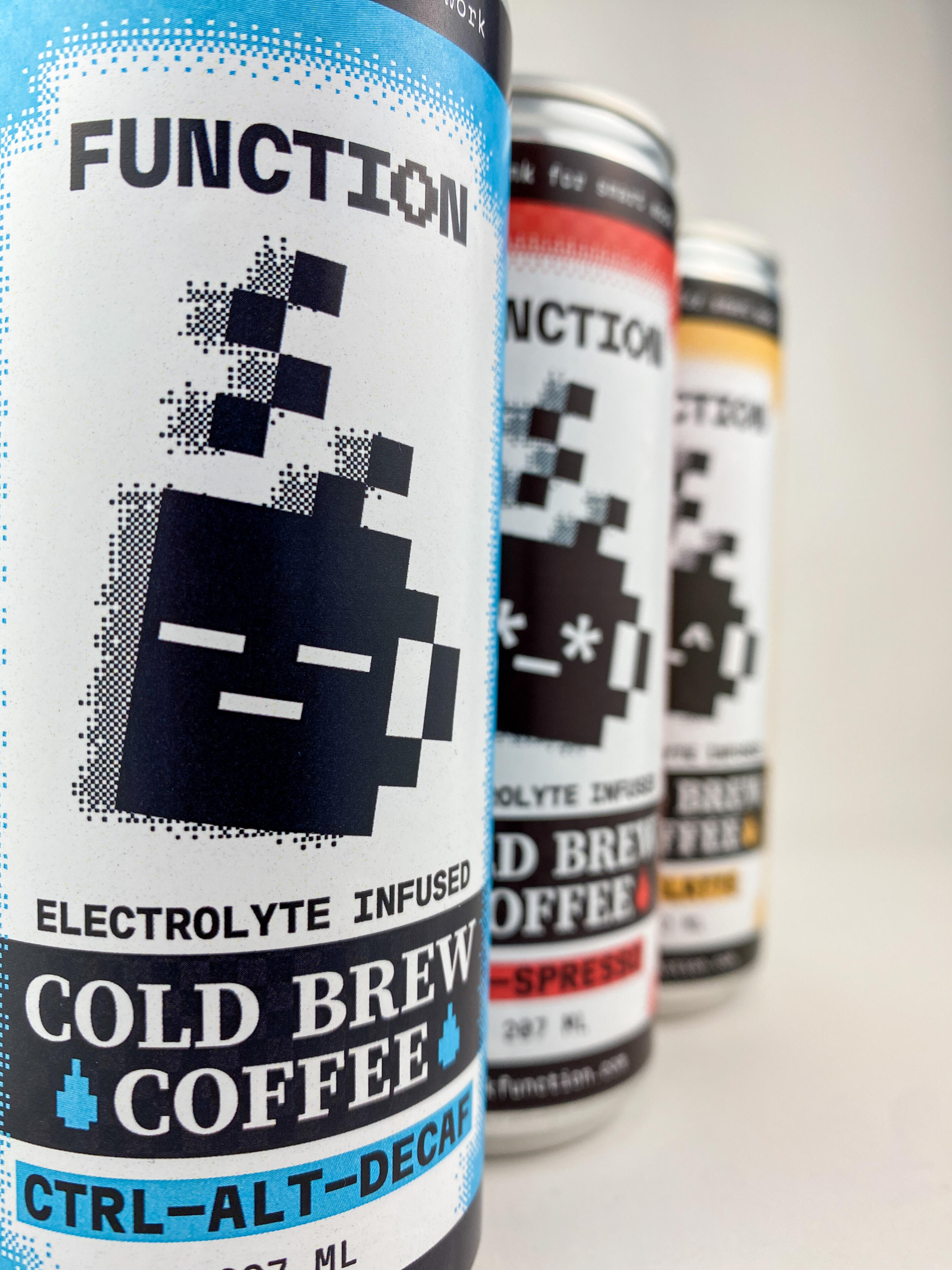 FUNCTION is a tech-inspired, gamified cold-brew coffee drink. Their new package design is intentionally designed to break the mould of other energy and/or gaming-inspired drinks seen on market shelves.Most tech-inspired caffeinated drinks approached their packaging style with an electric, yet overwhelming energy—designs that depicted the drinks as more hyper than productive.